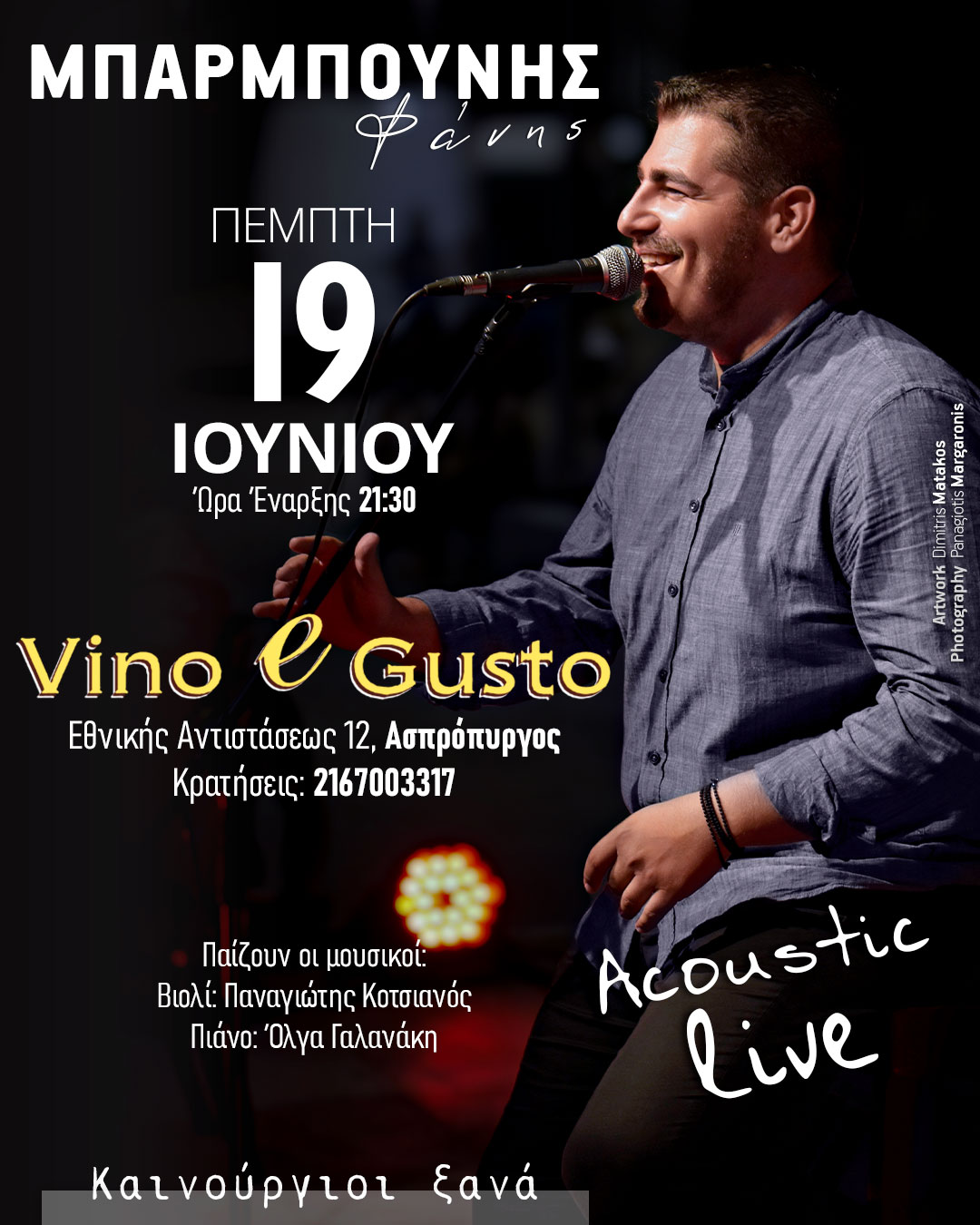 Ο Φάνης Μπαρμπούνης επιστρέφει στο αγαπημένο «Vino e Gusto» στον Ασπρόπυργο για ένα ακόμα acoustic live!